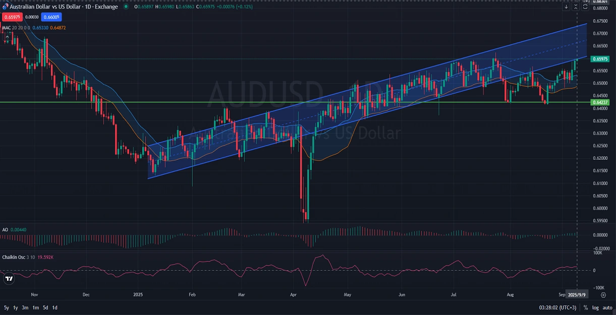 The AUD-USD is currently exhibiting a bullish trend, supported by recent economic indicators from Australia and the United States. Recent data from the Westpac-Melbourne Institute showed improved consumer sentiment in Australia, indicating potential strength in upcoming consumer spending patterns. Similarly, the National Australia Bank (NAB) business survey showed signs of improving business conditions, reflecting growing optimism in the Australian economy. Conversely, the US economy is facing mild headwinds, as indicated by mixed signals from the NFIB small business index and fluctuating inventory data from the American Petroleum Institute (API). Traders should anticipate volatility around October 14, 2025, when new economic sentiment and business condition data for Australia and the US will be released, potentially providing fresh momentum to AUD/USD trading.