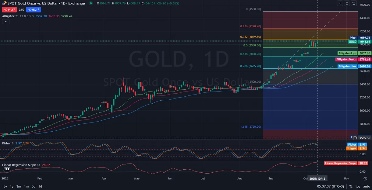 On the daily (D1) chart, the GOLD-USD pair is exhibiting continued upward momentum, recently recording a new all-time high (ATH) near $4,059.76, close to the previous yearly top. The Alligator indicator confirms a bullish trend, with the green Lips line positioned above the red Teeth, followed by the blue Jaw—indicating strong alignment in buying pressure. Price action currently fluctuates between the 0.5 Fibonacci level at $3,950 and the 0.382 level at $4,079.80, suggesting potential consolidation before a further push upward. The Fisher Transform indicator shows a reading of 2.97 (Fisher) and 2.94 (Trigger), reflecting strong bullish momentum but nearing potential overbought territory. Meanwhile, the Linear Regression Slope (28.32) supports ongoing strength in the uptrend. Should gold maintain support above $3,950, it could retest the $4,080 level and aim for new highs beyond $4,200, while a break below $3,950 may open a correction toward $3,820 (the 0.618 Fibonacci retracement).