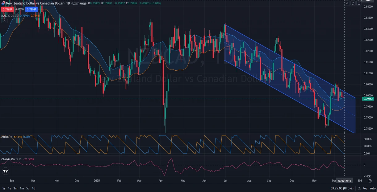 The daily chart for NZD CAD demonstrates long-term bearish sentiment, clearly reflected in a bearish price channel formation. Candlesticks currently gravitate towards the channel’s mid-band, suggesting persistent selling pressure aiming for the lower channel boundary. The Moving Average Channel currently resides above the candles, reinforcing the bearish trend. The Aroon indicator at 57.14% bullish and 0.00% bearish indicates recent upward moves have limited strength, further supported by the Chaikin oscillator at -23.369K, confirming underlying selling momentum.