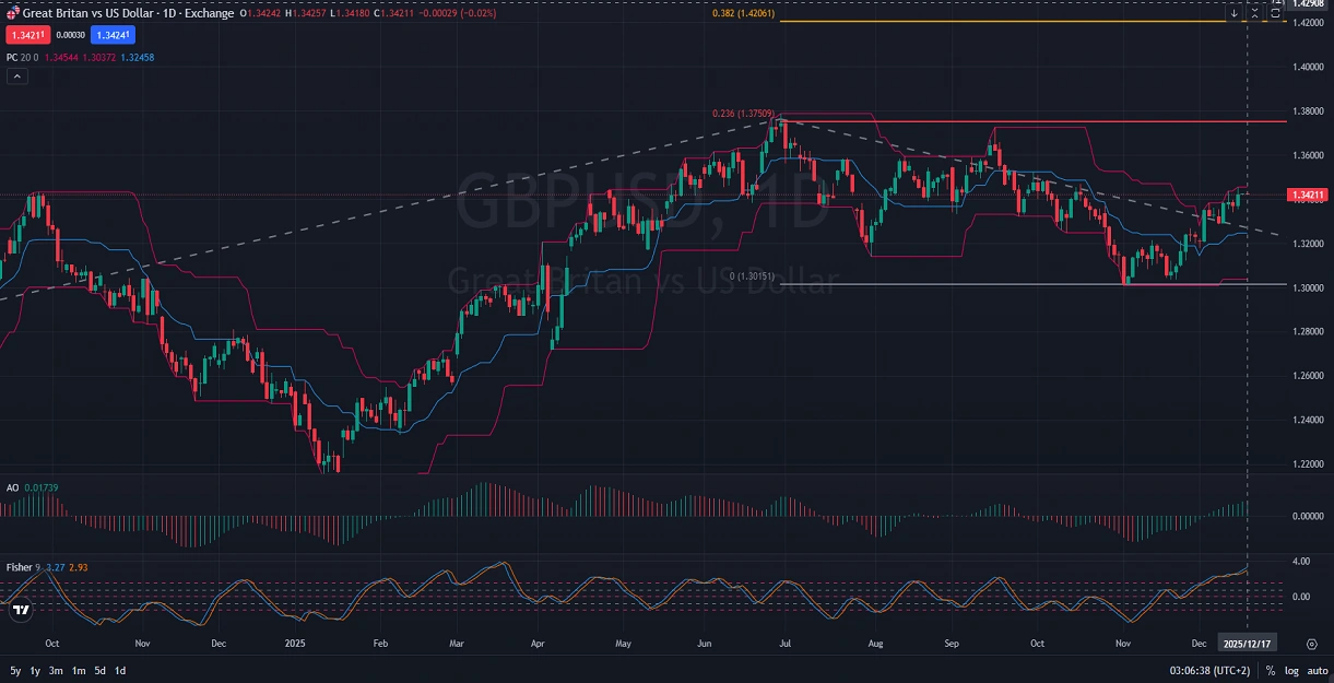 Analyzing the daily chart, GBP/USD has demonstrated a robust long-term bullish trajectory, with periodic corrective movements offering strategic entry points for bullish traders. The latest correction phase appears concluded, with bullish momentum now resuming. Immediate resistance stands at the Fibonacci level of 0.236, coinciding with a previously tested high at approximately 1.37509. Beyond this, the significant Fibonacci level of 0.382 at 1.42061 could act as a more potent resistance barrier. Current channel indicators pinpoint key price points at 1.34544 (upper channel), 1.32458 (mid-point), and 1.30372 (lower channel), with bullish sentiment further supported by positive readings from the Awesome Oscillator (0.01739) and Fisher Transform indicators (3.27, 2.93).