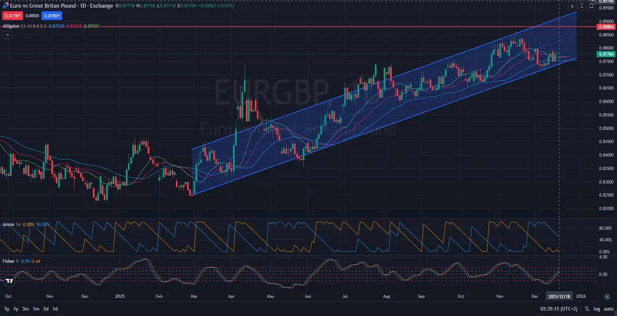 On the daily chart, EURGBP has been consistently trading within a bullish ascending channel. Each time price action touched either boundary of the channel, it bounced back inward, indicating robust market interest. The current trajectory of the bullish channel is slowly moving towards previous highs, suggesting potential for a breakout. The Alligator indicator also confirms this upward momentum as moving averages are aligned positively. Traders should be cautious around the resistance level of 0.8880, which could act as a critical zone either for a breakout or a pullback in the short term.