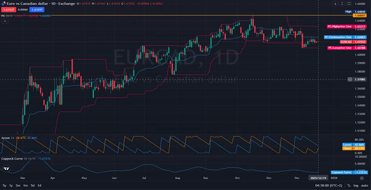 On the daily timeframe, EURCAD is currently trading within a horizontal range, with strong resistance at the 1.64641 level — the highest price recently observed — and support near the 1.60000 mark. Price action suggests consolidation after a previous bullish rally, with the pair now moving between the lower Price Channel (PC) line and the centerline, currently at 1.62053. This suggests neutral momentum with slight bearish bias in the short term. The Aroon indicator shows a weakening trend, with the Aroon Up at 28.57% and Aroon Down at 42.86%, pointing to a lack of strong directional momentum. Meanwhile, the Coppock Curve sits at -1.27215, reinforcing the idea that the bullish momentum has cooled, possibly signaling a correction or prolonged consolidation.