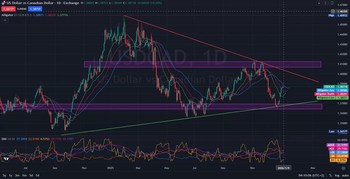 The USDCAD daily analysis shows a technical correction following the steep decline witnessed during the last weeks of 2025. So far, nearly half of that fall has been retraced as 2026 begins. On the chart, the Alligator indicator displays the blue Jaw (1.38856) flattening horizontally, while the red Teeth (1.38297) and green Lips (1.38073) are curling upward — suggesting that bullish momentum may still be developing but faces resistance. The key support zone is highlighted around 1.36500, reinforced by an ascending green trend line, while the resistance zone sits near 1.41000, marked by a descending red trend line. The Directional Movement Index (DMI 14) shows ADX at 29.71, indicating a moderate trend strength, with +DI (27.28) currently leading over -DI (23.91) — a potential bullish bias. However, the ADXR (31.11) suggests a maturing trend, signaling possible consolidation before a decisive breakout. Price action remains confined within the broader descending channel, so traders should watch for a confirmed breakout above 1.3900 or a rejection back toward 1.3700 for the next directional cue.