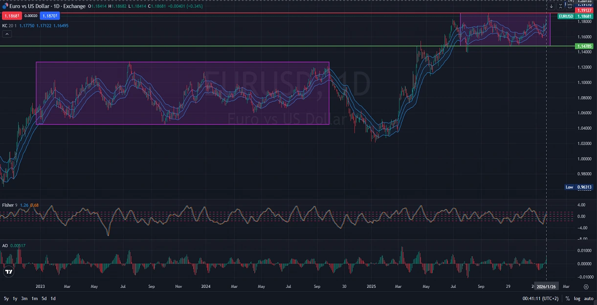 On the Daily (D1) chart, the EURUSD has transitioned from a sharp bullish slope into a defined range-bound phase. Currently, price action is oscillating between the support level of 1.14785 and the resistance ceiling of 1.19127, indicating a temporary equilibrium in the market. Technical indicators like the Keltner Channels show mid-range values around 1.17122, while the Fisher Transform at 1.26 suggests that the recent upward momentum may be overextended. The Accelerator Oscillator sits at a marginal 0.00517, reflecting a loss of bullish drive as the pair approaches the upper resistance zone. Historically, similar range patterns following a recovery have often preceded a bearish reversal, suggesting that sellers may soon look to regain control of the Euro vs US Dollar trend.