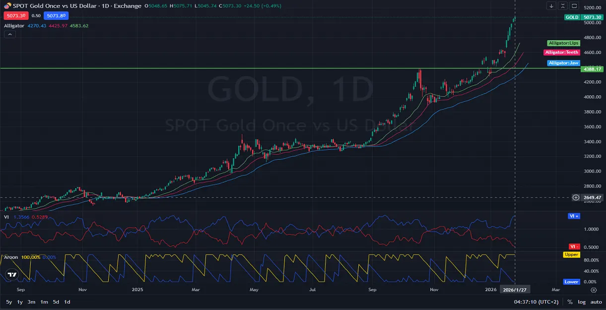 Technically, GOLD-USD is exhibiting a very strong uptrend on the daily chart, with price action well supported by the Alligator indicator. All three lines—Lips (green), Teeth (red), and Jaw (blue)—are sloping upward and placed below the current candlesticks, confirming a robust bullish trend. The recent breakout above the psychological resistance of $5000 and continued push above $5050 reinforce the momentum. The Vortex Indicator shows the VI+ at 1.3566 and VI- at 0.5289, indicating strong buying pressure. Meanwhile, the Aroon indicator signals a dominant trend with Aroon Up at 100% and Aroon Down at 0%. A support zone lies around the $4400 level, aligning with a previous consolidation range and the Alligator’s Jaw line, which could act as a key retest level in case of pullbacks.