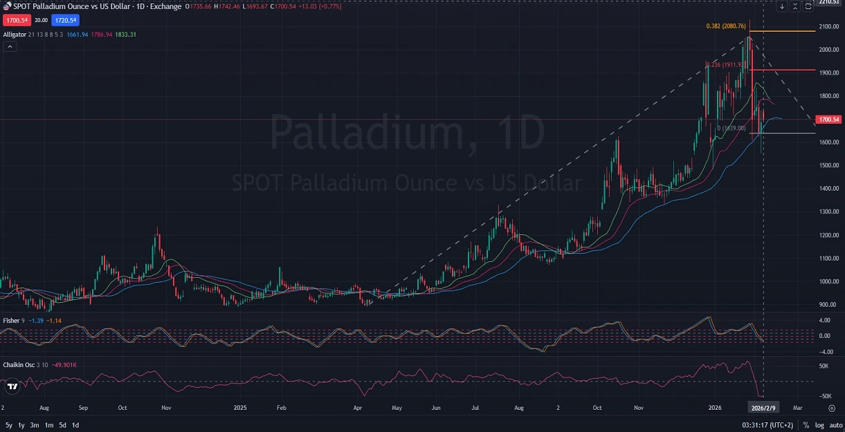 Analyzing the daily chart for XPD/USD reveals recent volatility, with prices initially consolidating before sharply rising into a bullish trend. Recently, a noticeable bearish correction has occurred, indicating potential market caution. The price action now suggests a period of consolidation as the bullish momentum weakens. The Fibonacci retracement levels indicate the next bullish targets at levels 0.236 and subsequently 0.382, signaling possible future upward movements. However, the Williams Alligator indicator at levels 1661.94, 1786.94, and 1833.31 shows uncertainty as the lines converge, reflecting potential indecision in the market. Additionally, the Fisher indicator at -1.39 and -1.14 and the Chaikin Oscillator at -49.901K further emphasize current bearish momentum and reduced market strength.