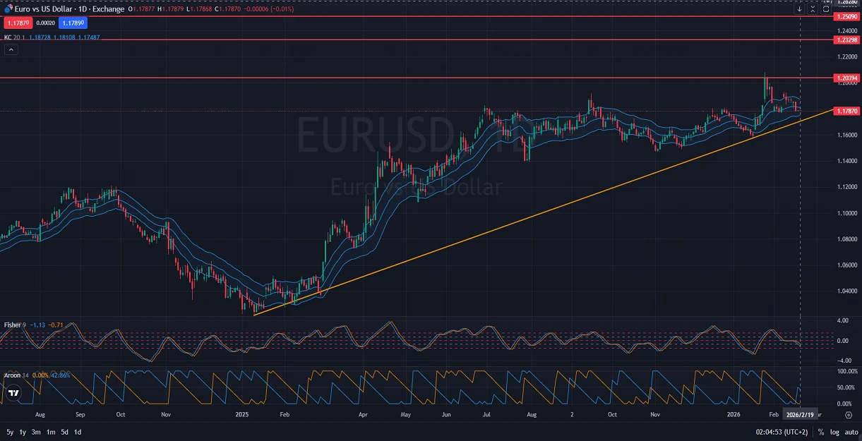 Analyzing the daily EUR/USD chart reveals critical insights. Over an extended period, the pair has consistently created lower highs after significant bullish corrections, signaling possible exhaustion of bullish momentum. The recent high at 1.20394 is lower than previous highs at 1.23298 and 1.25090, supporting a potential bearish or sideways trend scenario moving forward. Indicators such as the Keltner Channel (1.18728 upper band, 1.18108 middle, and 1.17487 lower band) highlight current price volatility and potential resistance levels. The Fisher indicator (-1.13 and -0.71) emphasizes a bearish sentiment, while the Aroon indicator (0.00% up and 42.86% down) further supports this bearish perspective. Traders should closely monitor these levels and indicators for potential entry or exit points.