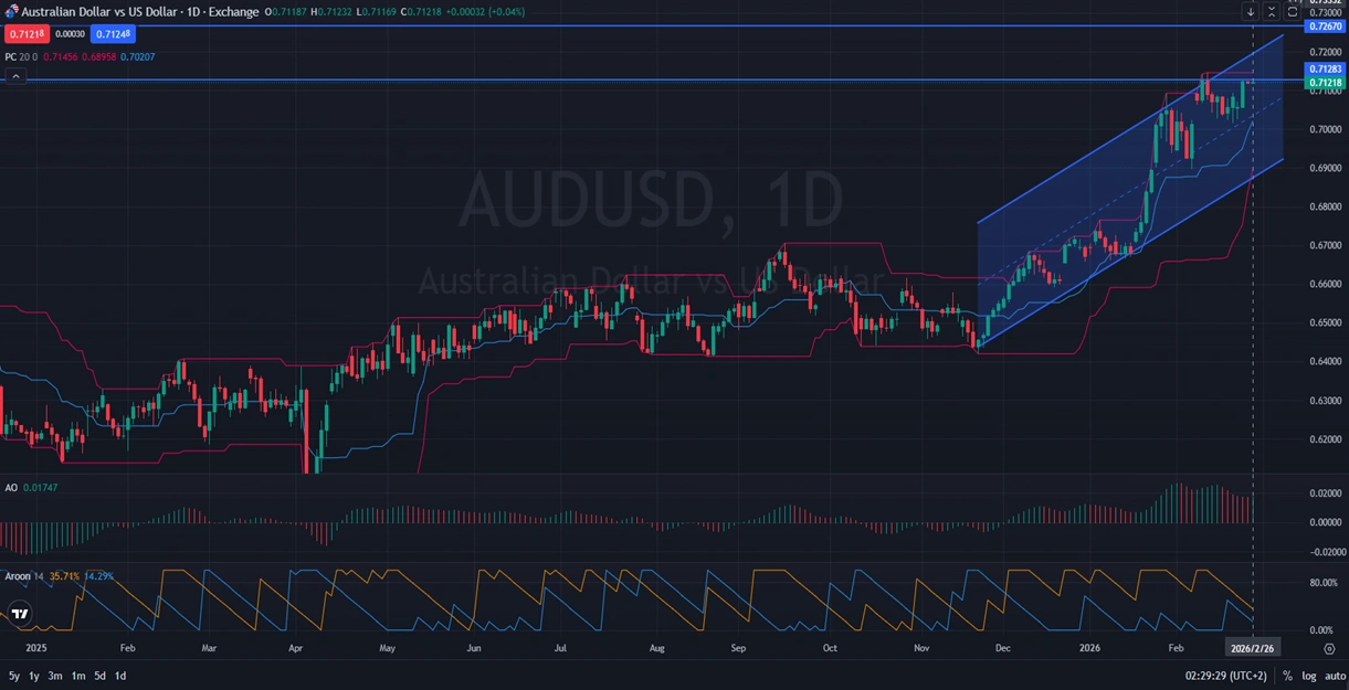 On the daily timeframe, AUDUSD has been in a clear bullish trend within an ascending channel. Recently, the currency pair’s bullish momentum accelerated, with price action gravitating towards the mid-band of the channel, signaling ongoing buying interest. However, the pair is currently testing significant resistance at the 0.71283 level, showing signs of indecision. Should AUD/USD break through this resistance, traders can anticipate the pair targeting the historically significant resistance level of 0.72670. The Awesome Oscillator, currently at 0.01747, remains positive, further supporting bullish sentiment. Meanwhile, the Aroon indicator (35.71% up, 14.29% down) suggests that bullish strength, although currently dominant, requires confirmation for continuation.