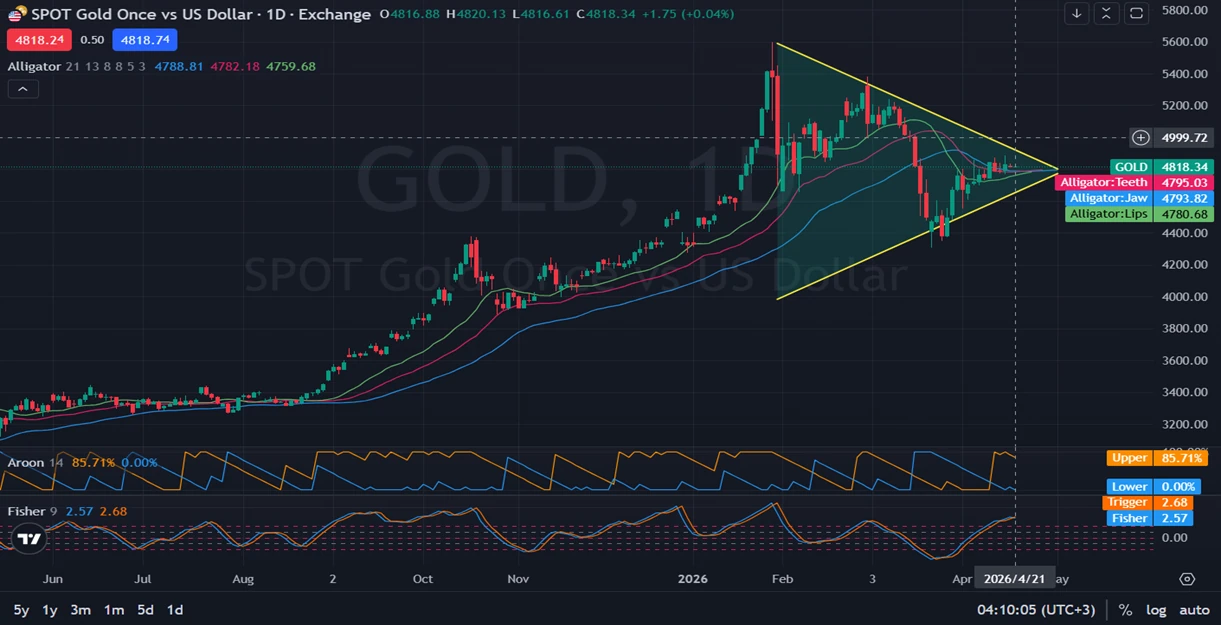 Looking at the daily chart of Gold-US Dollar, price is moving inside a large symmetrical triangle, or a disjoint consolidation channel, formed after the sharp surge to the all-time high near 5600 and the later pullback toward the 4300 region. The current price around 4800–4818 places gold close to the middle-to-upper area of this compression structure, which suggests the market is preparing for a decisive directional move but has not confirmed it yet. The Alligator indicator shows strong compression, with the lines clustered tightly together: the red line is currently on top, the blue line sits just below it, and the green line is underneath while trying to turn upward. This kind of structure usually reflects a market that is transitioning from consolidation toward a breakout attempt, but confirmation is still needed through a daily close above triangle resistance or below triangle support. The Aroon 14 reading at 85.71 for Aroon Up and 0.00 for Aroon Down signals that bullish pressure has recently regained some control, even though the trend is not fully released yet. Meanwhile, the Fisher 9 reading near 2.57 versus the Trigger at 2.68 suggests momentum remains elevated but is not yet giving a clean acceleration signal, which fits the idea of a market pausing before a larger move. From a price-action perspective, the key resistance zone is the upper boundary of the triangle and then the psychological 5000 region, while support is found near the clustered Alligator levels around 4795–4780, followed by deeper structural support toward the lower triangle boundary.