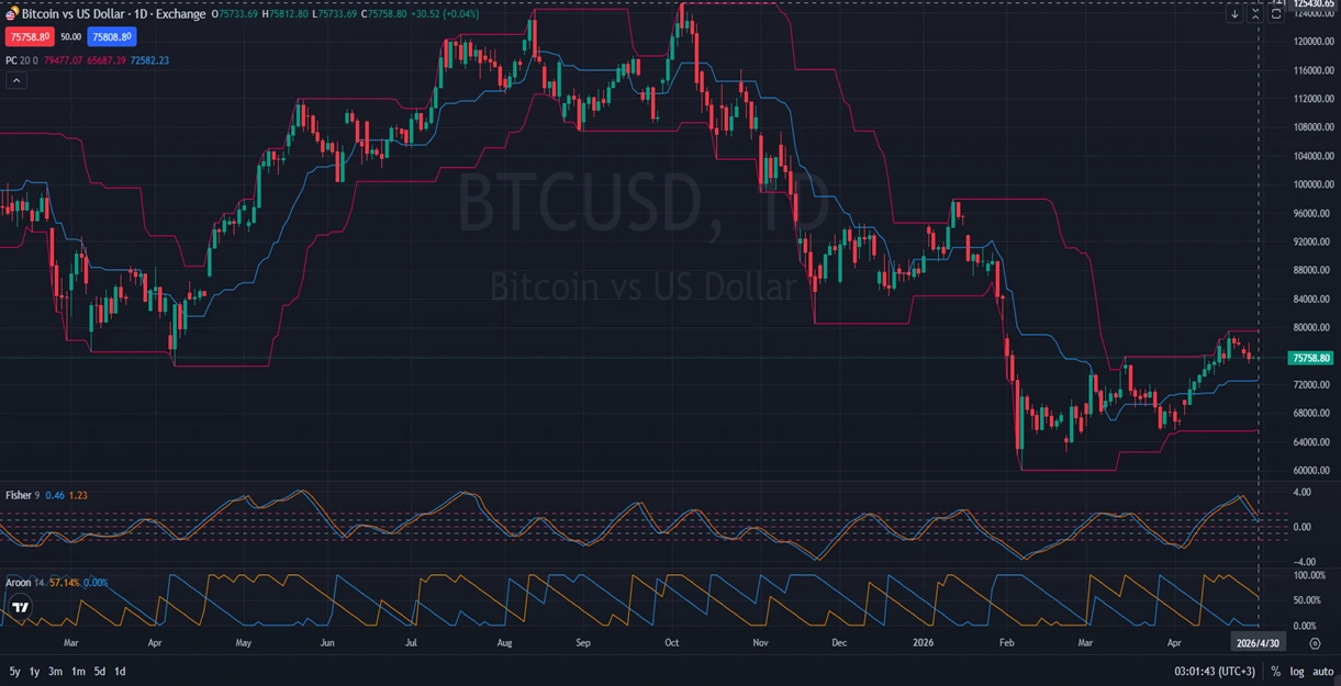 On the daily chart, BTC USD shows signs of recovery after a strong bearish trend, with candles beginning to form a gradual and steady bullish structure. Although the recent upward moves are not very strong, they indicate that selling pressure may be weakening. The latest correction following the most recent upward push appears to have ended, suggesting that buyers are attempting to regain control. The Price Channel levels at 79477.07, 65687.39, and 72582.23 show that BTC/USD is trading within a recovery zone but still below major resistance. The Fisher indicator at 0.46 and 1.23 supports a developing bullish momentum, while the Aroon indicator at 57.14% and 0.00% indicates that the upward trend is beginning to strengthen. Overall, BTC/USD technical analysis points to a potential continuation of the recovery if momentum continues to build.